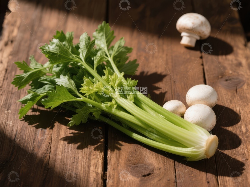 / 新鲜芹菜与蘑菇置于木质桌面
