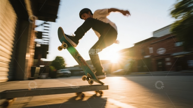 / 夕阳下滑板手在城市街道上进行空中动作