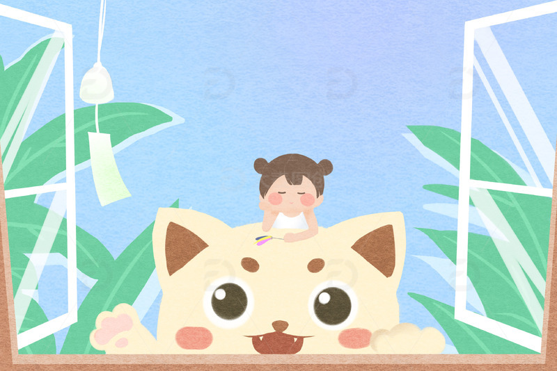/ 动物猫猫卡通小人夏天手绘q版背景