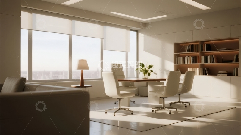 / 现代简约风格的明亮会议室配有木质书架和舒适座椅