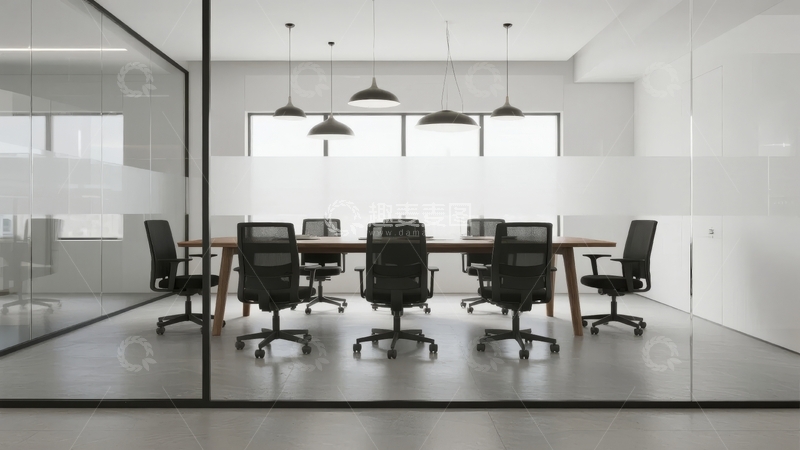 / 现代办公室会议室配备黑色办公椅和木质长桌