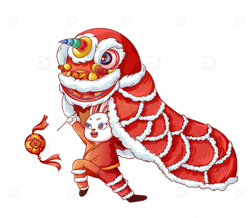 / 红色扁平肌理兔年新年兔子舞狮绣球