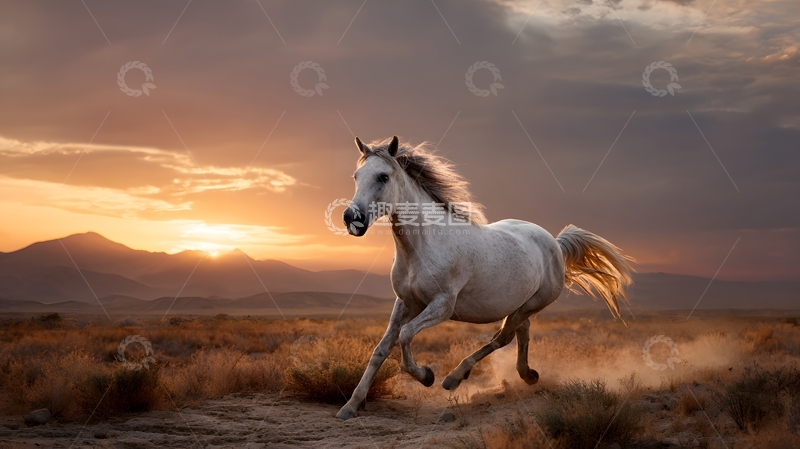 / 夕阳下自由奔腾的白马展现自然的力量