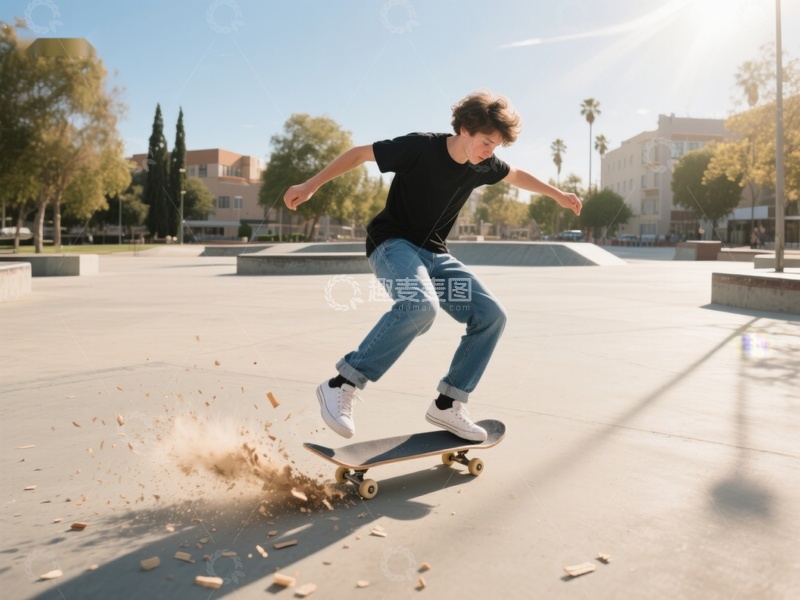 滑板少年在公园中表演特技