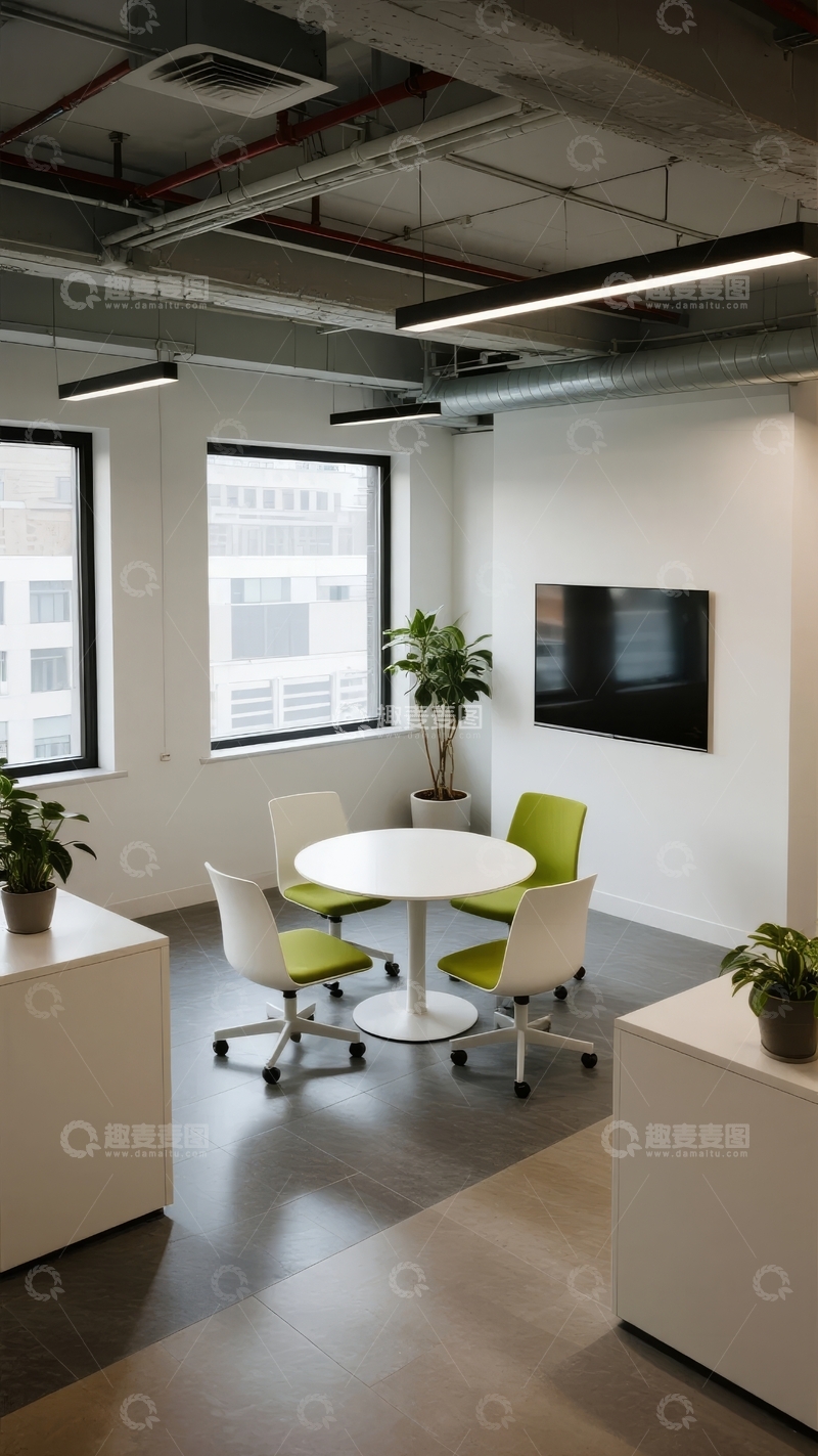 现代办公室内的小型会议室配有圆形桌椅和绿植