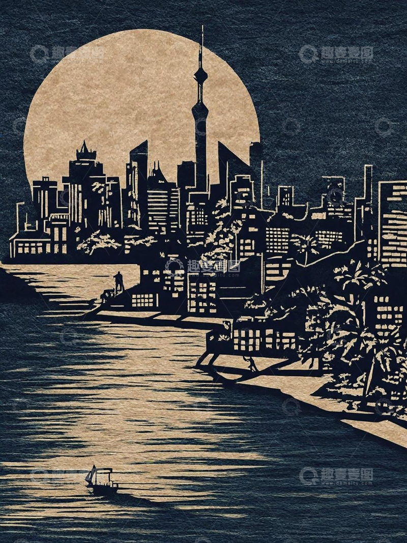 海滨中秋剪纸拼贴复古插画