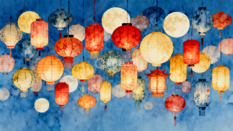 / 抽象中秋节灯笼新中式水彩画