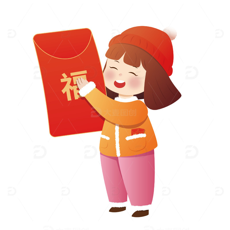 可爱卡通新年春节小孩收压岁钱手抱红包
