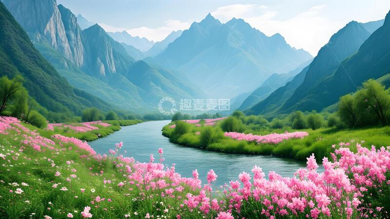 唯美自然风光美景溪流山川粉色花海