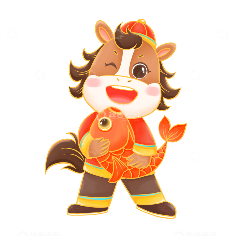 / 卡通风春节小马卡通形象手持金鱼插画素材