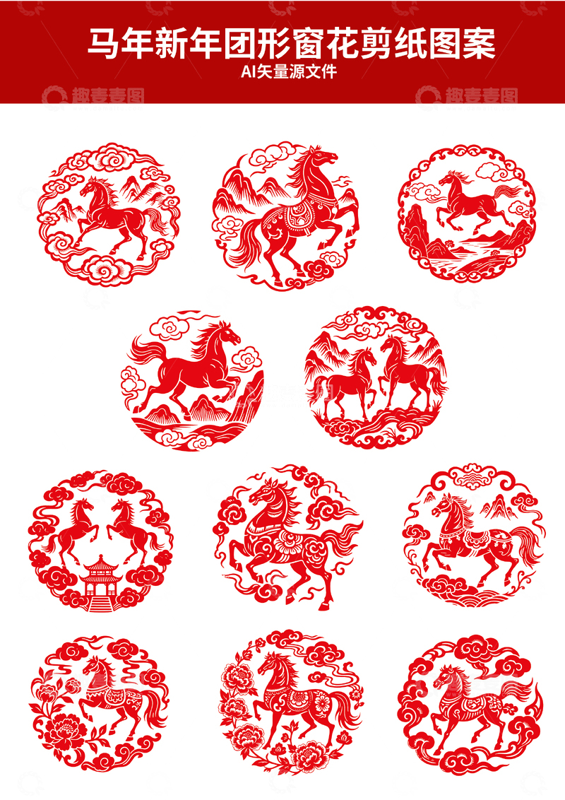 / 马年新年团形窗花剪纸图案
