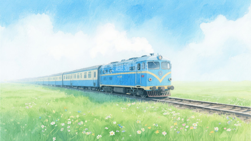 蓝天草地火车彩铅插画2