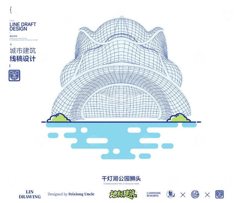 / 佛山干灯湖公园狮头城市地标矢量建筑线描