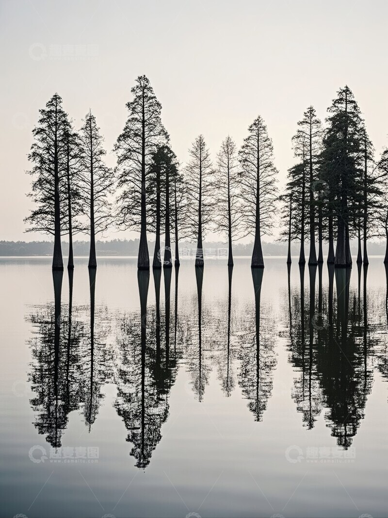 水杉林倒影静谧湖面
