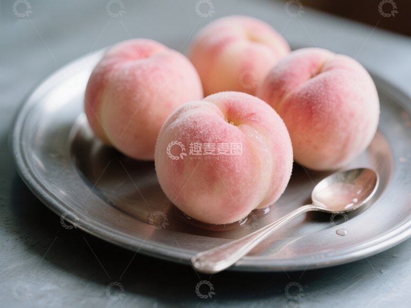 盘中新鲜桃子与银勺