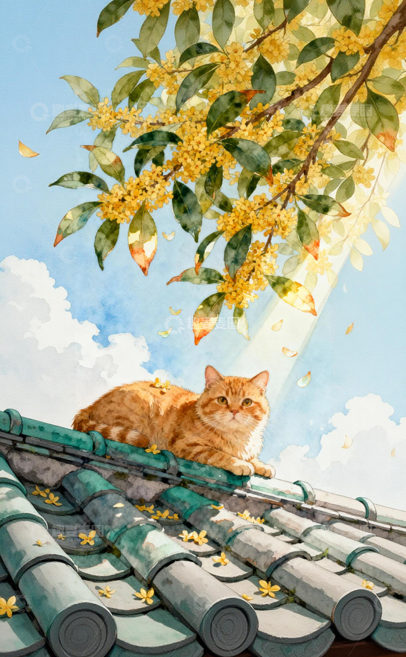/ 古韵屋顶橘猫赏桂图