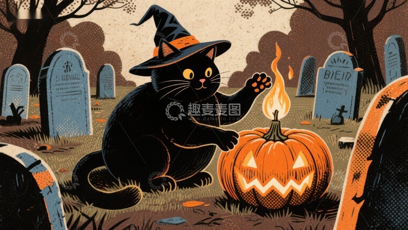 / 黑猫巫师点燃南瓜灯