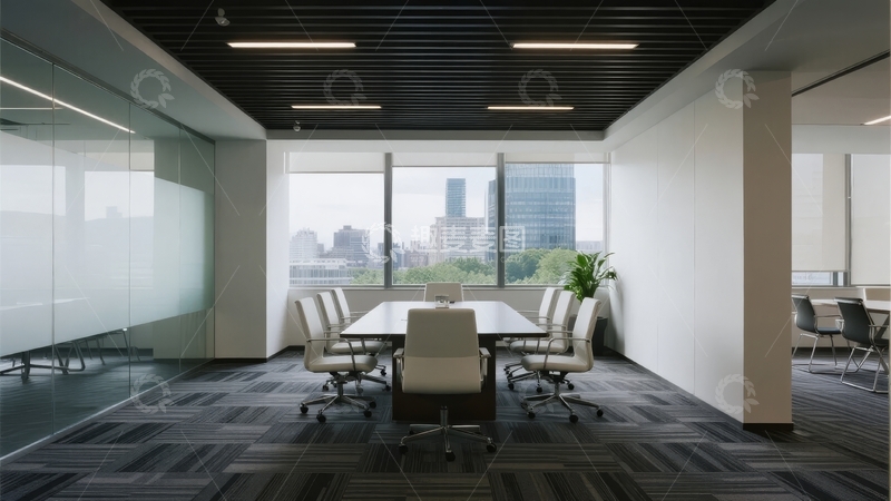 / 现代办公室会议室配备长桌和城市景观窗户