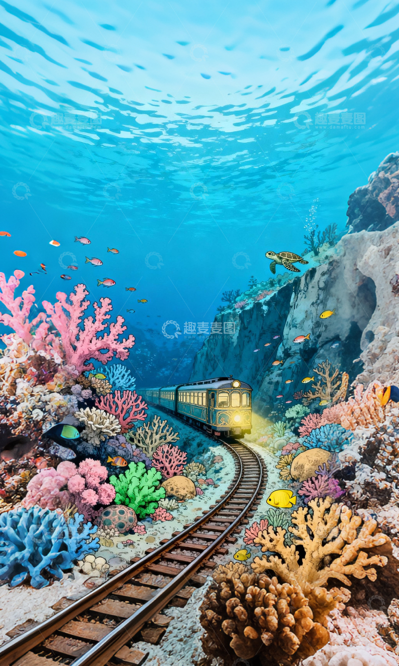 水下火车奇幻景观创意插画