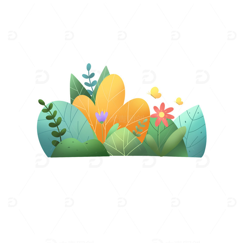 / 手绘春天鲜花绿色绿叶树叶花朵草丛蝴蝶
