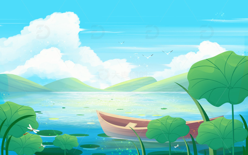 / 夏天蓝天白云下的湖面小船藏在荷叶风景