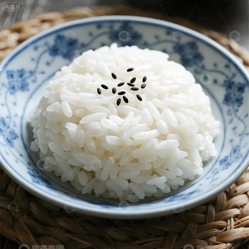 青花瓷盘装白米饭特写图